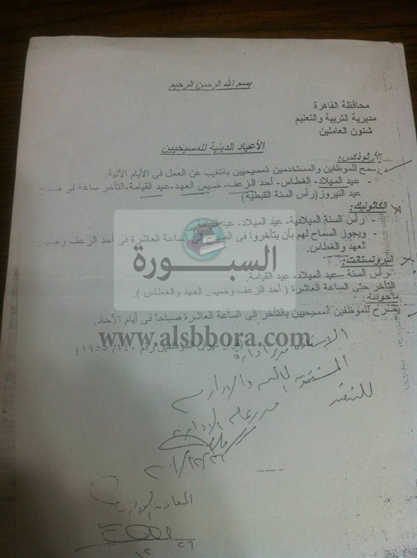ينشر موقع السبورة أهم قرارات لمنح الأخوة المعلمين المسيحيين بجميع فئاتهم "الأرثوذكس والكاثوليك والبروتستانت" إجازة فى أعيادهم أو التأخير ساعة فى أعياد أخرى.