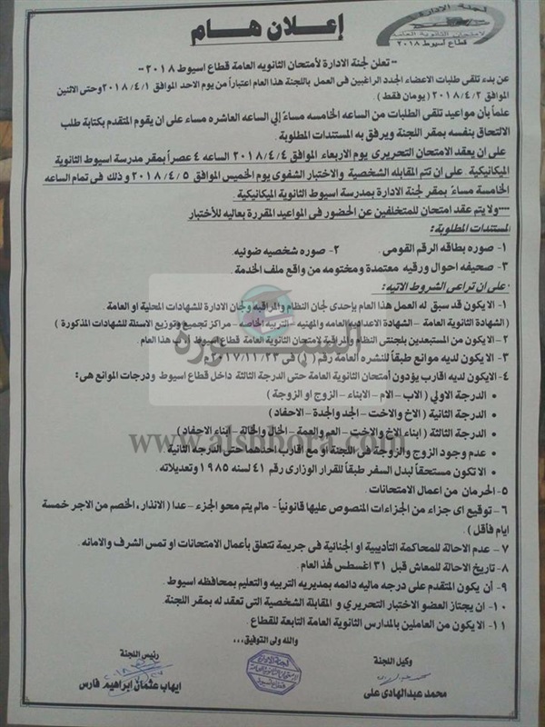 أعلنت مديرية التربية والتعليم بمحافظة أسيوط شروط التحاق المعلمين بامتحانات الثانوية العامة والمستندات المطلوبة ومواعيد المقابلات.