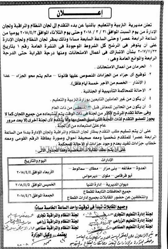 أعلنت مديرية التربية والتعليم بمحافظة المنيا عن بدء أعمال التقديم للمعلمين الراغبين فى التقدم للمشاركة بامتحانات آخر العام غدا السبت الموافق 31 مارس، ويستمر التقديم الى الثلاثاء الموافق 2 أبريل 2018.