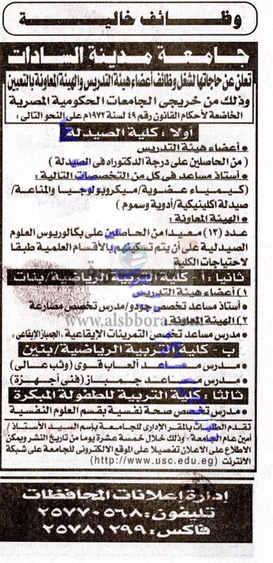 تعلن جامعة مدينة السادات عن حاجتها الى أعضاء هيئة التدريس فى 3 كليات، وعلى الراغبين فى الحصول على الوظيفة تقديم الطلبات بالمقر الادارى للجامعة باسم امين عام الجامعة وذلك خلال 15 يوما من تاريخ نشر الاعلان فى جريدة الجمهورية اليوم السبت الموافق 31 مارس 2018.