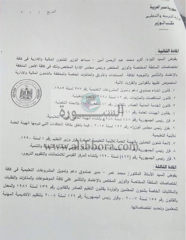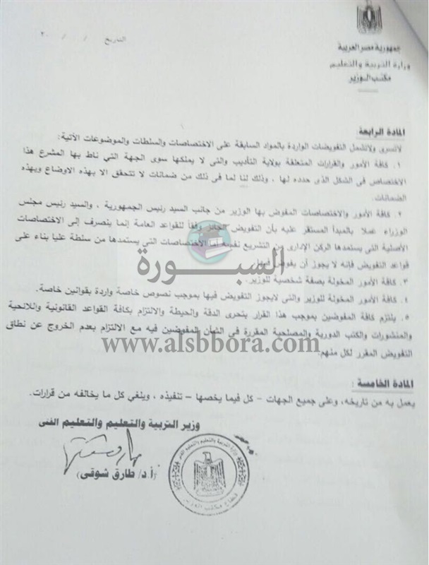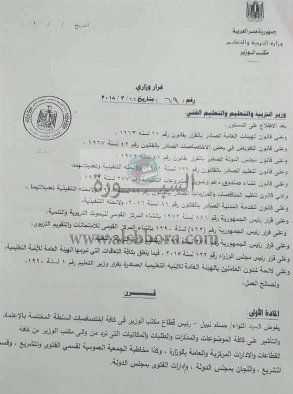 أصدر الدكتور طارق شوقى، وزير التربية والتعليم القرار الوزاري رقم 69 لسنة 2018، الذي نص على التالى: