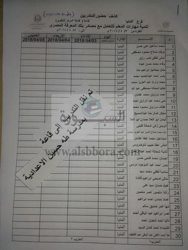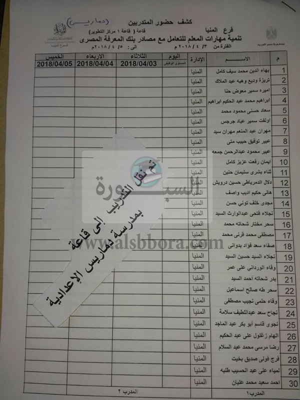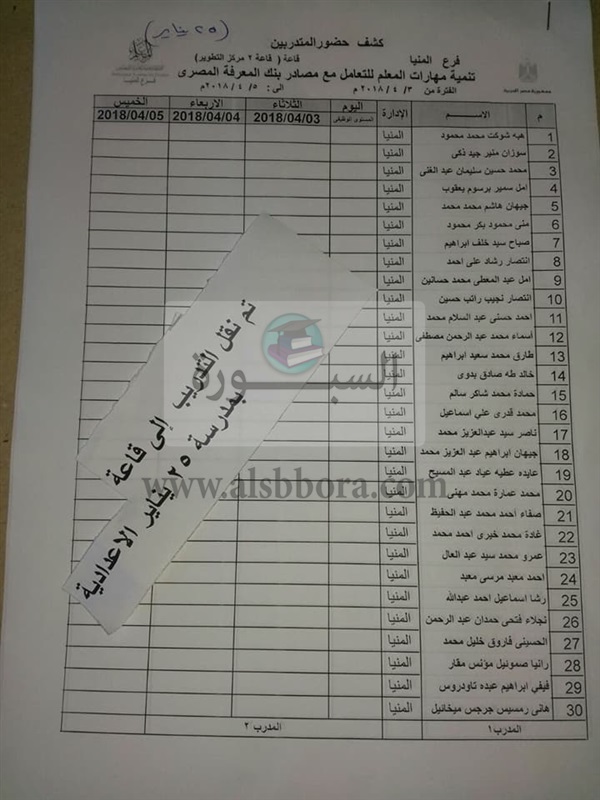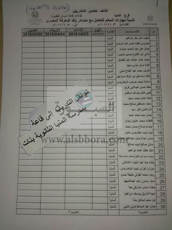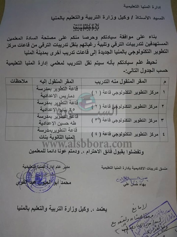 أعلنت الاكاديمية المهنية للمعلمين التابعة لمديرية التربية والتعليم بمحافظة المنيا عن نقل التدريبات من مركز التطوير بالمنيا الجديدة الى قاعات تدريبيى بمدينة المنيا، وننشر القاعات التى سوف يتم التدريب عليها، والتى جاءت كالتالى: