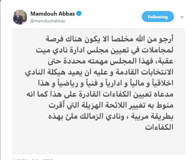 طالب ممدوح عباس رئيس نادى الزمالك الأسبق،ان يتم تعين مجلس ادارة بدون مجاملات وكتب فى تدوينة عبر موقع التدوينات القصيرة "تويتر"، قائلاً:"أرجو من الله مخلصا ألا يكون هناك فرصة لمجاملات فى تعيين مجلس إدارة نادى ميت عقبة.. هذا المجلس مهمته محددة حتى الانتخابات المقبلة وعليه أن يعيد هيكلة النادى أخلاقيا وماليا وإداريا وفنيا ورياضيا".