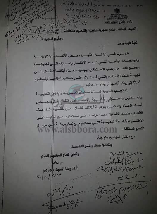 بالمستندات| بيان هام من وزارة التربية والتعليم الى المديريات والادارات والمعلمين بشأن الألعاب الالكترونية التى يمارسها الطلاب