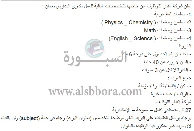 تعلن مدرسة خاصة في سلطنة عمان عن وظائف جديدة للمعلمين والمعلمات وذلك وفقا لنص الإعلان التالي:-