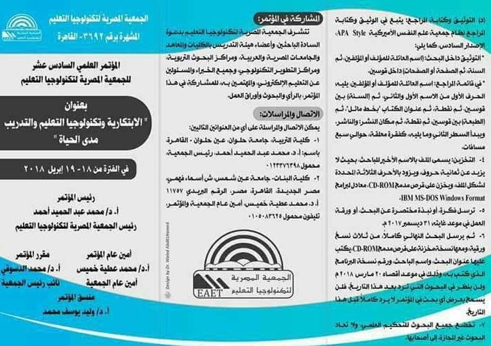 تقيم الجمعيه المصريه لتكنولوجيا التعليم المؤتمر العلمي السادس عشر بعنوان( الابتكارية وتكنولوجيا التعليم والتدريب مدى الحياة) في الفترة من 19- 20 إبريل 2018بدار ضيافة جامعة عين شمس
