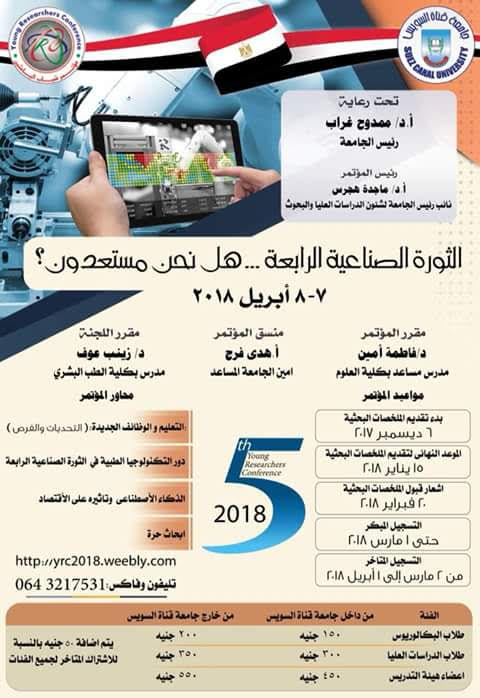 تنطلق غدا السبت وعلى مدار يومين فعاليات مؤتمر شباب الباحثين الخامس والذى تنظمه لجنة شباب الباحثين بجامعة قناة السويس تحت عنوان الثورة الصناعية الرابعة .هل نحن مستعدون؟ فى الفترة من 7 – 8 أبريل 2018 .