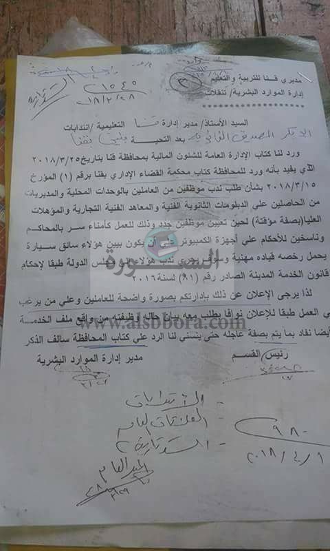 أعلنت مديرية التربية والتعليم بقنا عن ورود كتاب محكمة القضاء الادارى بقنا برقم 1 المؤرخ بـ 15 مارس 2018، بشأن طلب ندب موظفين من العاملين بالوحدات المحلية والمديريات من الحاصلين على الدبلومات الفنية والمعاهد الفنية التجارية والمؤهلات العليا "بصفة مؤقتة" لحين تعيين موظفين جدد.