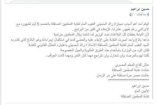 اليكم أحد أهم أسباب مجازاة رائد الحسينى النقيب العام لنقابة المعلمين المستقلة بالخصم 5 أيام لظهوره مع الابراشي رغم ظهور عشرات الزملاء في كثير من البرامج .