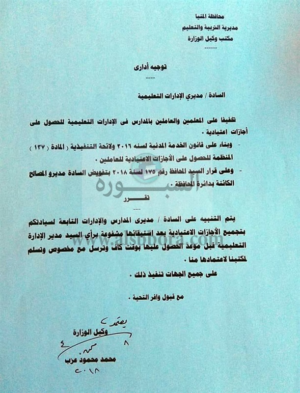 أرسلت مديرية التربية والتعليم بمحافظة المنيا بيان هام الى الادارات التعليمية بشأن الاجازة الاعتيادية للمعلمين وارسالها مبكرا الى الادارات حتى يتم احتسابها دون تأخير.