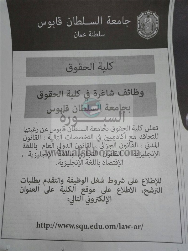 تعلن جامعة السلطان قابوس عن حاجتها الى أعضاء هيئة التدريس من المصريين وعلى الراغبين فى الحصول على الوظيفة الدخول على موقع الجامعة من خلال اعلان جريدة الأخبار اليوم الاثنين الموافق 9 ابريل 2018.