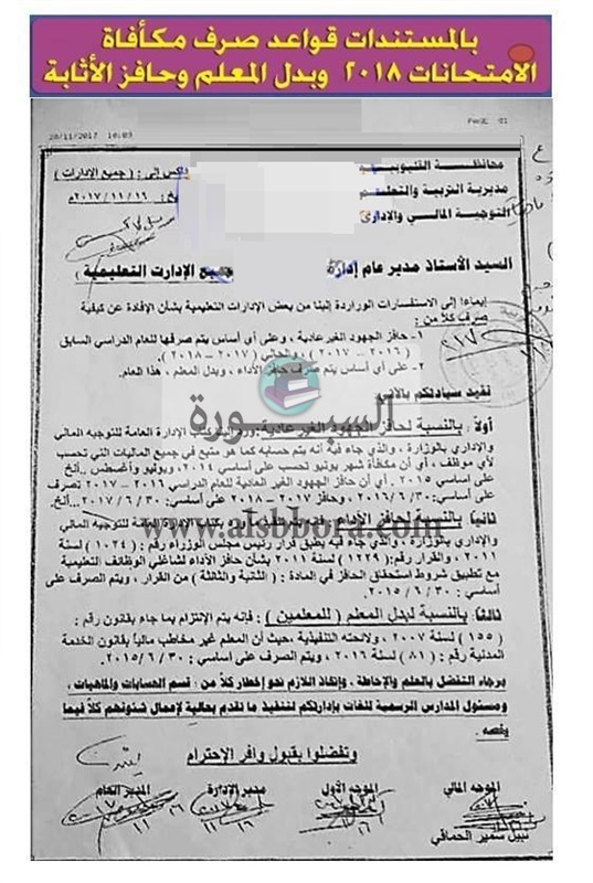 تنشر "السبورة" فاكس التوجيه المالي والإداري بوزارة التربية والتعليم الخاص بقواعد جديدة لصرف مكافآت وبدلات المعلمين لعام 2018.