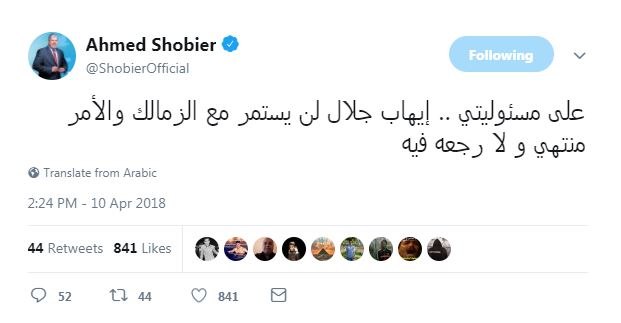 وكتب شوبير، عبر حسابه بموقع التدوينات القصيرة "تويتر"، "على مسئوليتى.. إيهاب جلال لن يستمر مع الزمالك والأمر منتهى ولا رجعة فيه".