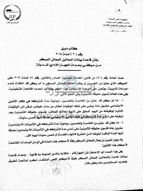 ننشر الكتاب الدورى رقم 2 لسنة 2018 بشأن المحالين للمعاش المبكر