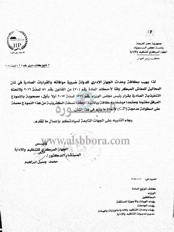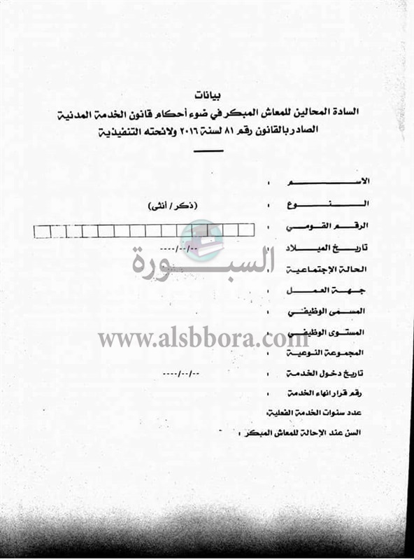 ينشر موقع السبورة الكتاب الدورى رقم 2 لسنة 2018 بشأن قاعدة بيانات المحالين للمعاش المبكر من موظفى وحدات الجهاز الادارى للدولة.
