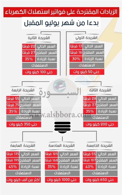 تنشر "السبورة" إنفوجرافيك، خاص بنسب الزيادة لكل شريحة استخدام، وذلك وفقا لتصريحات مصدر مسئول بوزارة الكهرباء والطاقة المتجددة، عن انتهاء جهاز تنظيم مرفق الكهرباء من إعداد سيناريوهات الزيادة المتوقعة في الشرائح، والمقرر تطبيقها في يوليو المقبل وهي كالآتي: