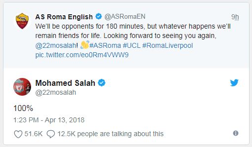 وجه نادى اى سى روما الذى كان يلعب له محمد صلاح لاعب منتخب مصر وليفربول الانجليزى العام الماضى، جاء فيها "سنكون خصوماً لمدة 180 دقيقة، ولكننا سنبقى أصدقاء مدى الحياة... نتطلع لرؤيتك مرة أخرى".