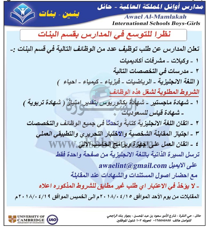 تعلن مدارس حائل السعودية عن وظائف جديدة للمعلمين والمعلمات في المواد وذلك وفقا لنص الإعلان التالي:-