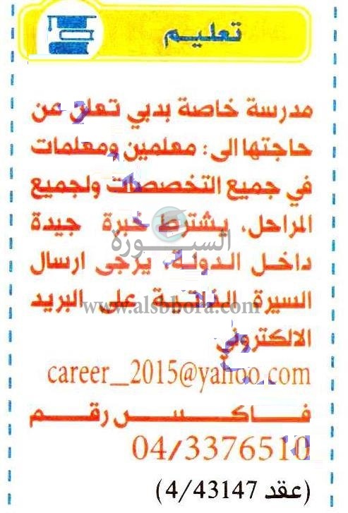 تعلن مدرسة خاصة في دولة الإمارات عن وظائف جديدة للمعلمين والمعلمات وذلك وفقا لنص الإعلان التالي:-