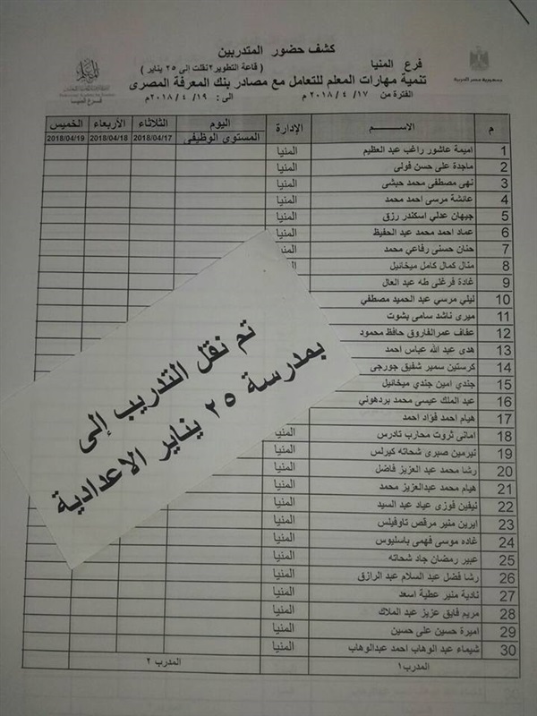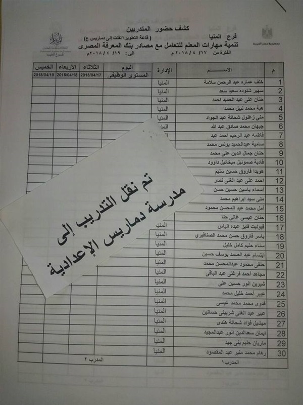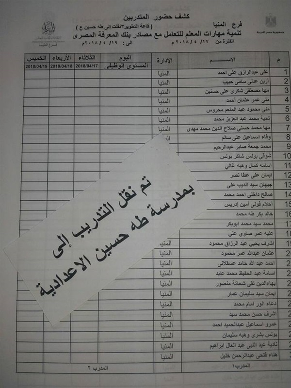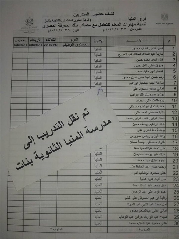 أعلنت ادارة المنيا التعليمية التابعة لمديرية التربية والتعليم بمحافظة المنيا عن نقل تدريب المعلمين من أجل الترقى الى مدرسة المنيا الثانوية بنات على ان يتم التدريب من الغد 17 الى 19 ابريل الجارى.