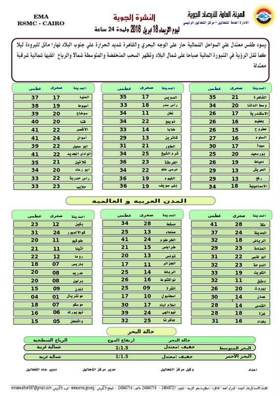 وفيما يلي بيان بدرجات الحرارة المتوقعة غدا على محافظات ومدن مصر :