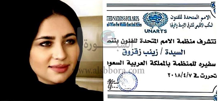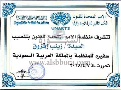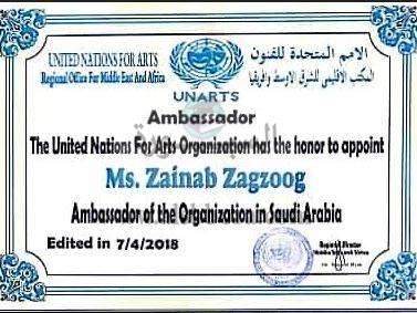 تسلمت المهندسة زينب مصطفى زقزوق منصبها كسفيرة منظمة الأمم المتحدة للفنون في المملكة العربية السعودية تقديرا لجهودها في مجال الفن.