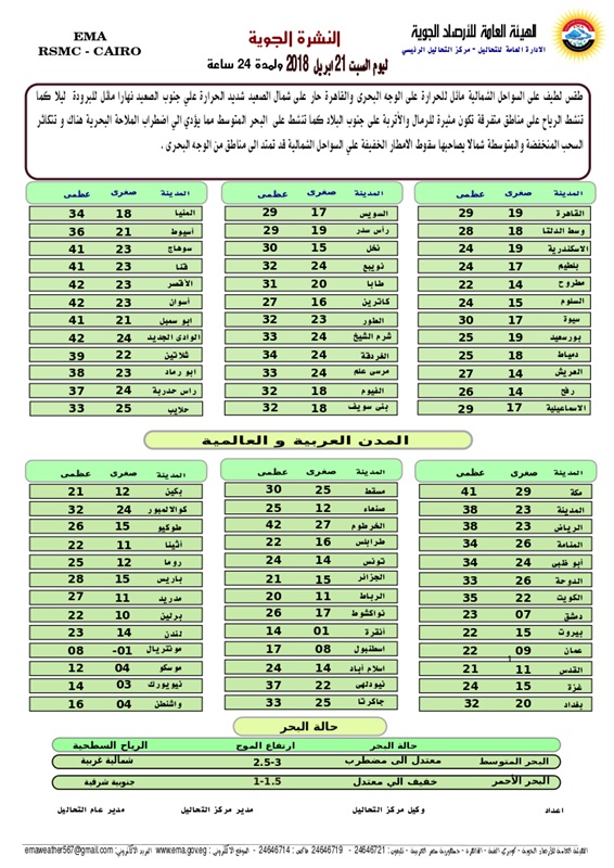 حذر خبراء هيئة الأرصاد الجوية من انخفاض جديد لدرجات الحرارة،اليوم السبت، حيث يسود طقس لطيف على السواحل الشمالية مائل للحرارة على الوجه البحرى والقاهرة، حار على شمال الصعيد، شديد الحرارة على جنوب الصعيد نهارًا مائل للبرودة ليلاً، كما تنشط الرياح على مناطق متفرقة تكون مثيرة للرمال والأتربة على جنوب البلاد، كما تنشط على البحر المتوسط، مما يؤدى إلى اضطراب الملاحة البحرية هناك.
