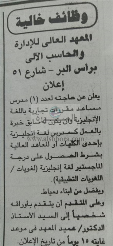 أعلن المعهد العالى للادارة والحاسب الآلى برأس البر عن حاجته الى اعضاء هيئة التدريس، وعلى الراغبين فى التقدم تقديم الطلبات شخصيا الى عميد المعهد فى موعد غايته 15 يوما من تاريخ نشر الاعلان فى جريدة الجمهورية اليوم السبت الموافق 21 ابريل 2018.