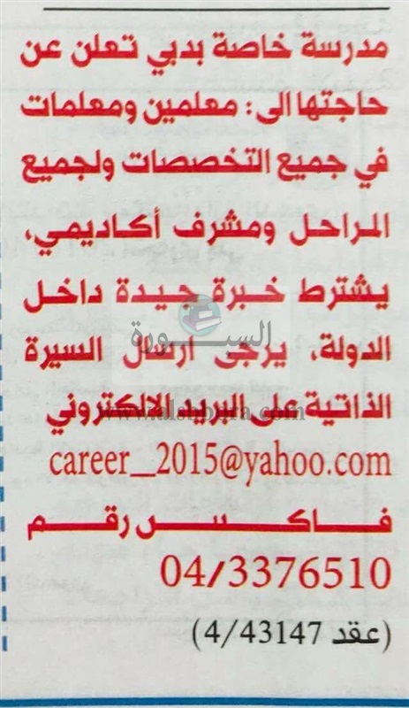 تعلن مدرسة خاصة في دولة الإمارات عن وظائف جديدة للمعلمين والمعلمات في جميع المواد وذلك وفقا لنص الإعلان التالي: