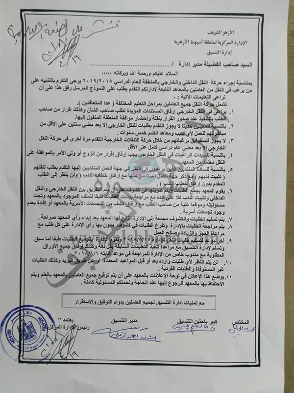 ارسل قطاع المعاهد الأزهرية خطابا الى جميع المعاهد بتلقى طلبات التنقل والانتداب سواء كان الداخلى أو الخارجى الى وزارات أخرى على أن يتم مراعاة وفقا للشروط التالية: