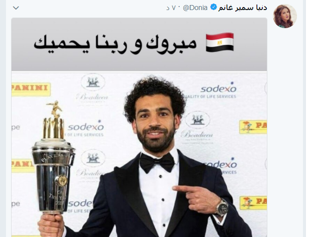 عقب فوز محمد صلاح بأحسن لاعب فى الدورى الانجليزى لكرة القدم موسم 2018/2017، وجهة الفنانة دنيا سمير غانم رسالة الى محمد صلاح عبر موقع التدوينات الصغيرة تويتر.
