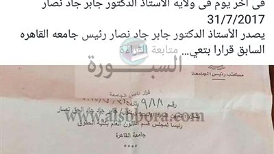 "رافت فودة" ينشر مستند قرار تعيين جابر نصار نفسه رئيسا لقسم القانون العام بحقوق القاهرة ..و"نصار" يرد انا اقدم استاذ واتقاضي ١٢ جنيه